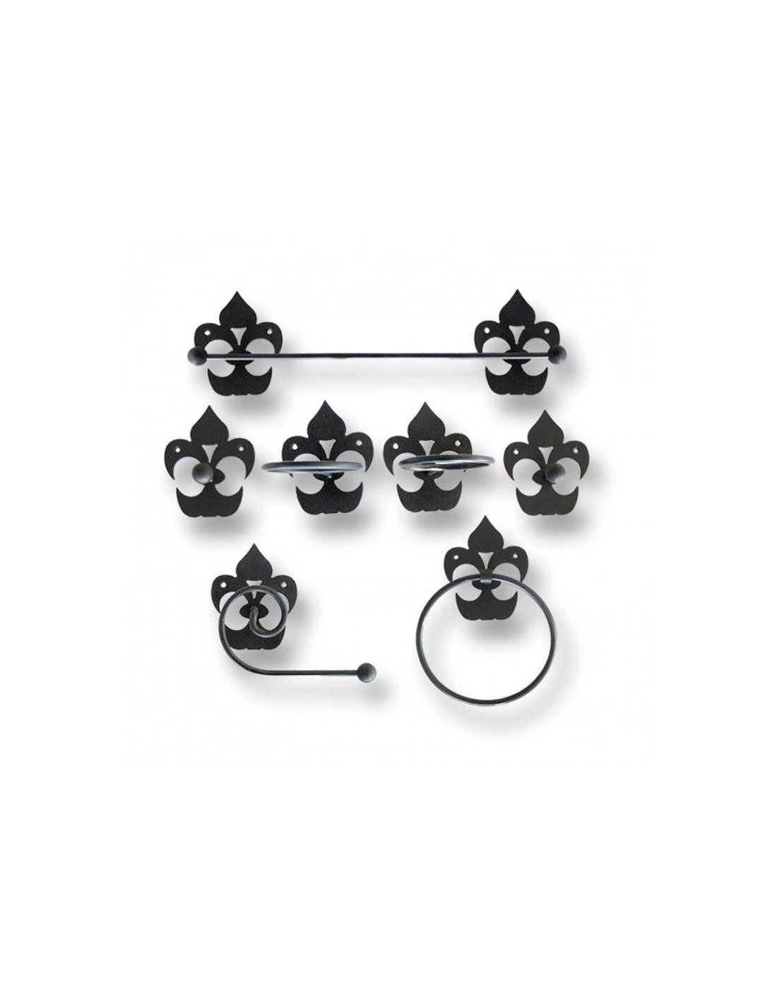 Accesorios de Baño en Forja Juego El Palmar. Ofrecemos una variedad de accesorios de baño en forja con forma de rosa, como porta toallas, percheros, portarrollos de papel higiénico, ganchos y estantes. Puedes combinarlos y crear un conjunto coordinado que transforme tu baño en un oasis de elegancia.
